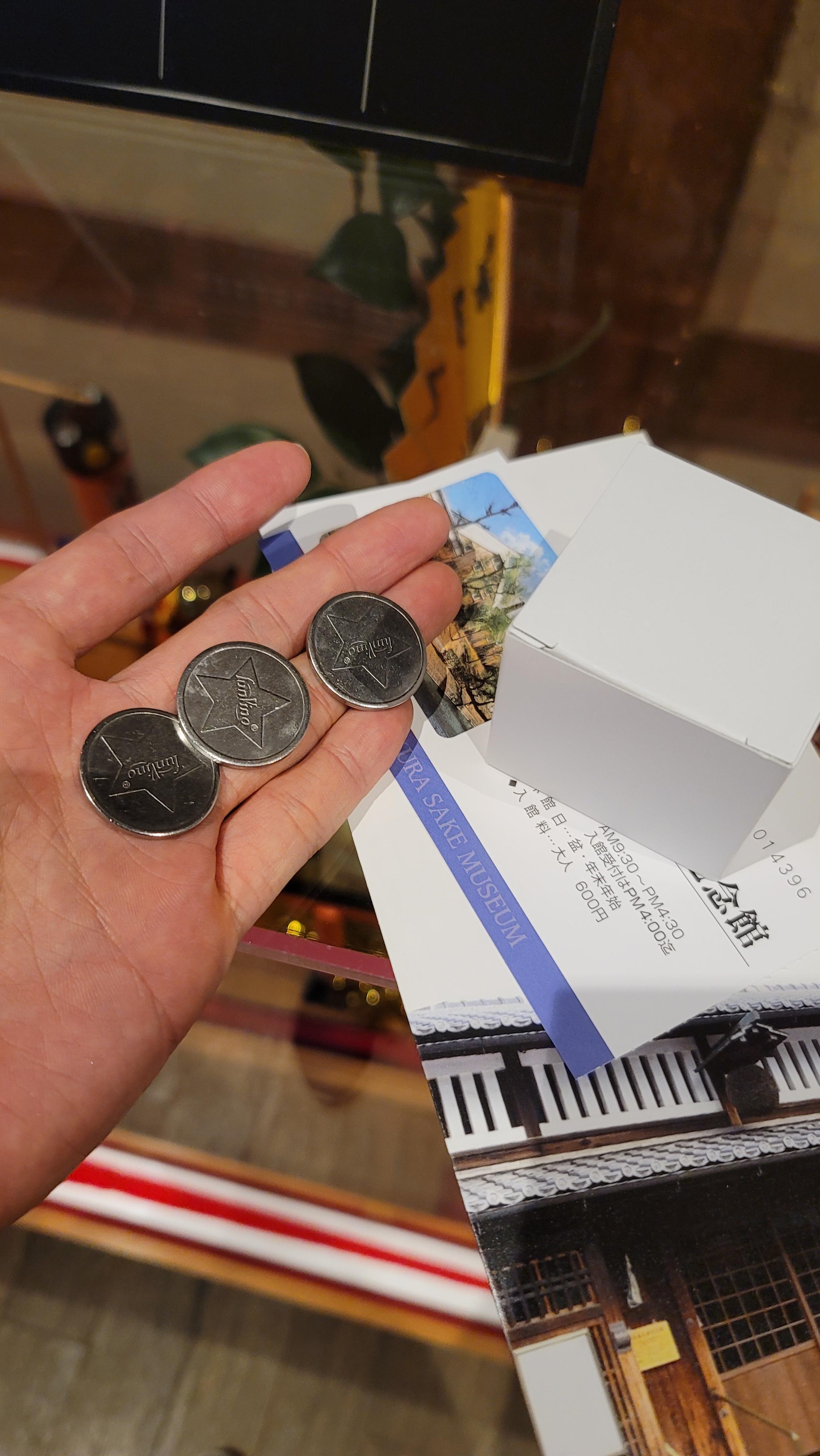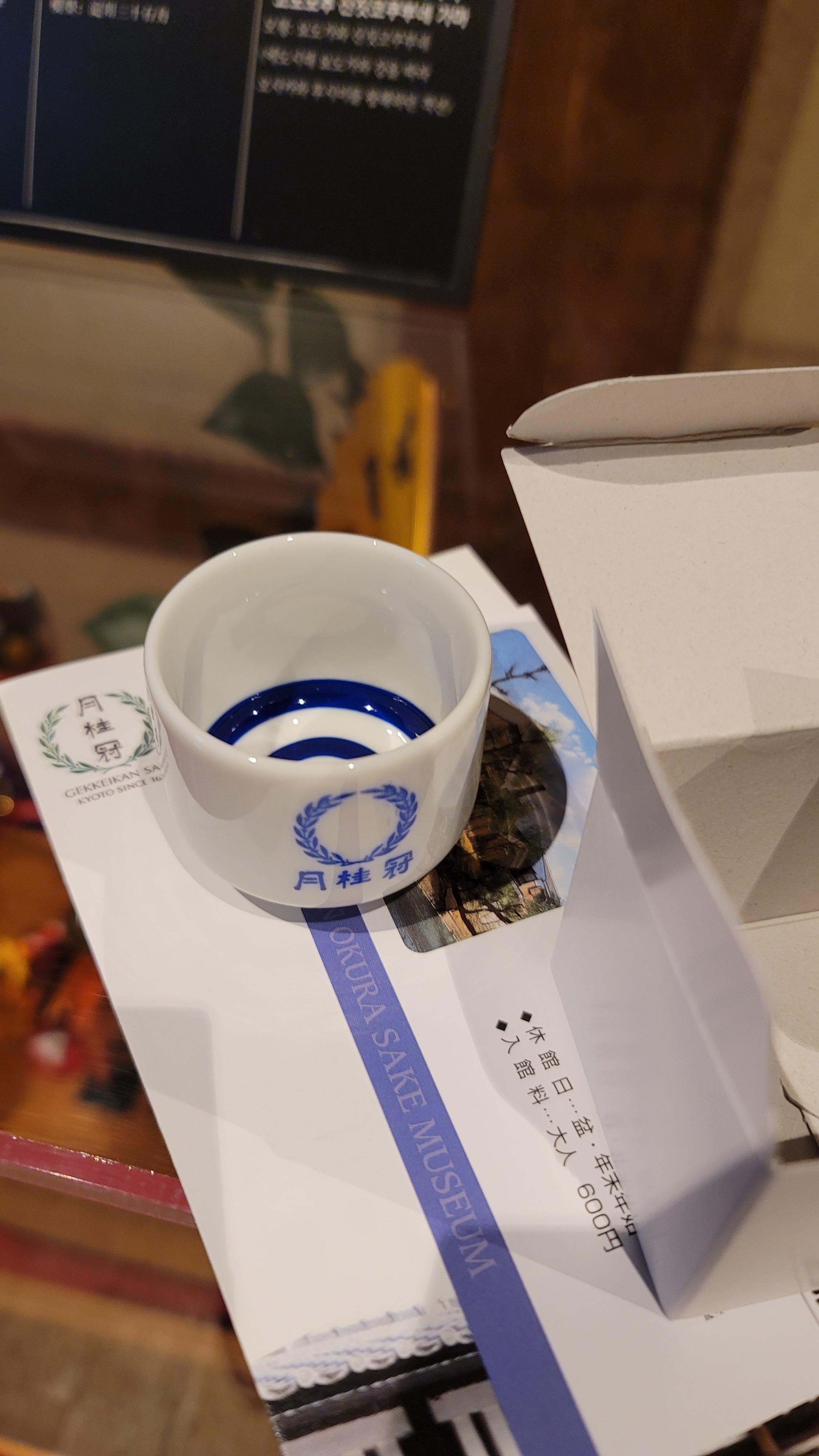 사케시음할 기념품 사케잔 입장료를 내면 박물관 관람후 사케를 시음할수 있는 코인 3개와 사케 잔을 줍니다.